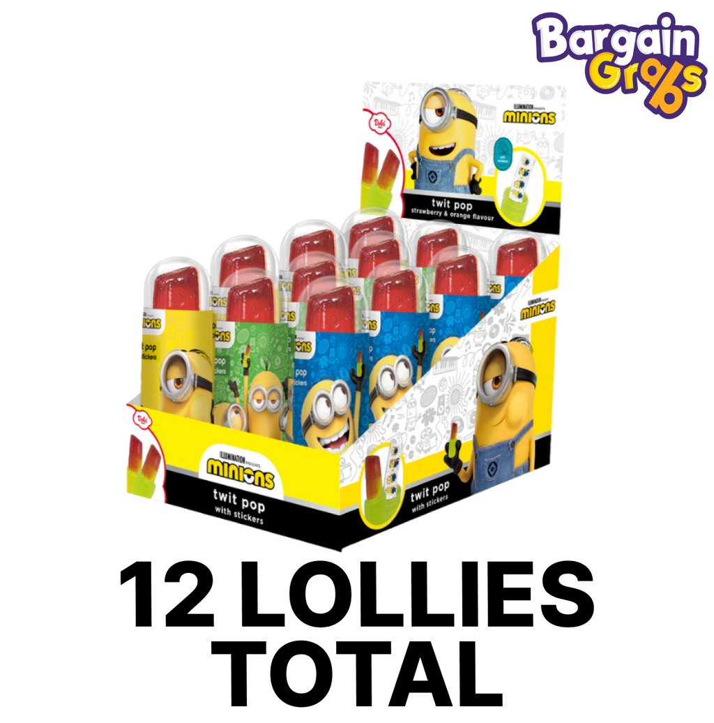 Add a fun and fruity twist to your candy selection with the Minions Twister Pop Lolly — now available in a 12-pack of 15g lollies. Shaped like a playful twist and featuring colourful Minions-themed packaging, these novelty lollipops are sure to delight kids and collectors alike.