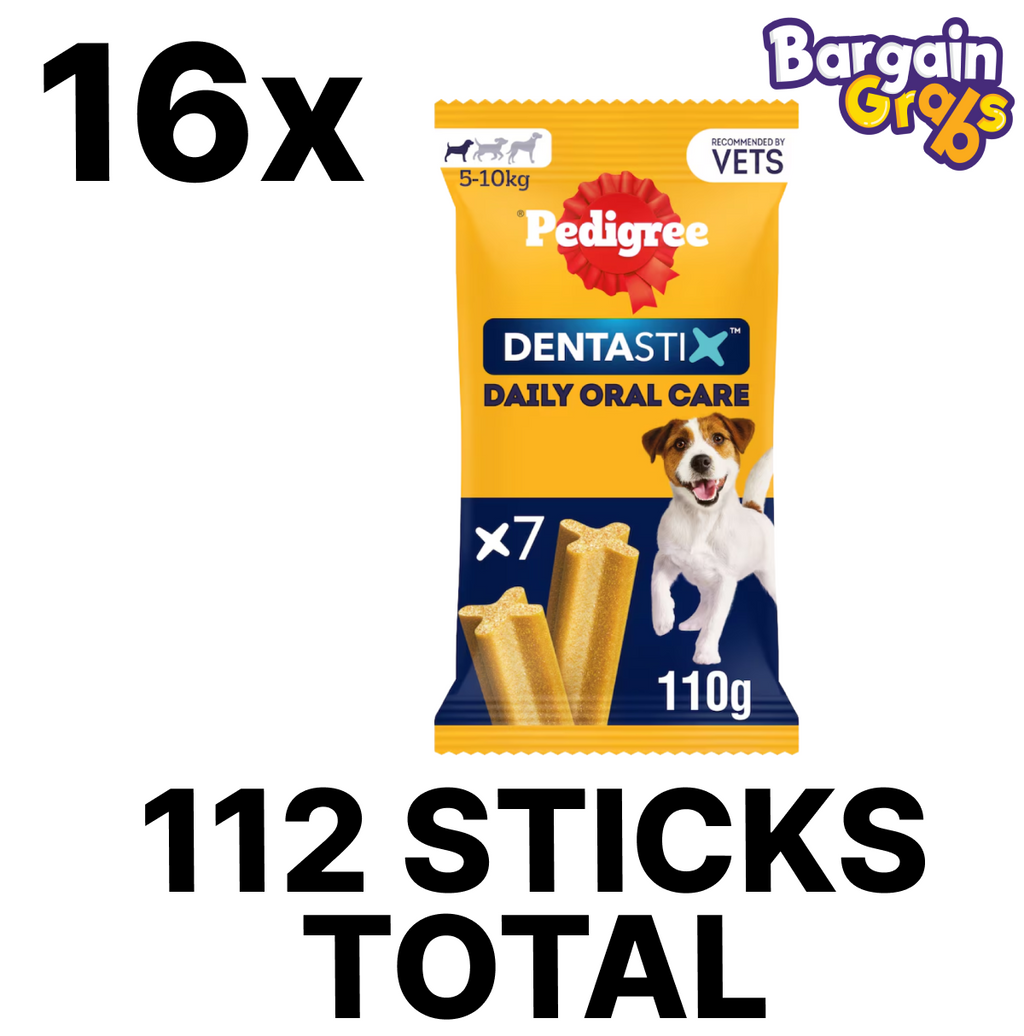 Support your dog’s dental health with the Pedigree DentaStix Daily Dental Chews for Small Dogs (5–10kg) – now in a mega-value pack of 16 x 7-stick pouches, totalling 112 chews. Specially designed for small breed dogs, these functional snacks are clinically proven to reduce tartar build-up by up to 80% when used daily, helping to maintain clean teeth and healthy gums.
