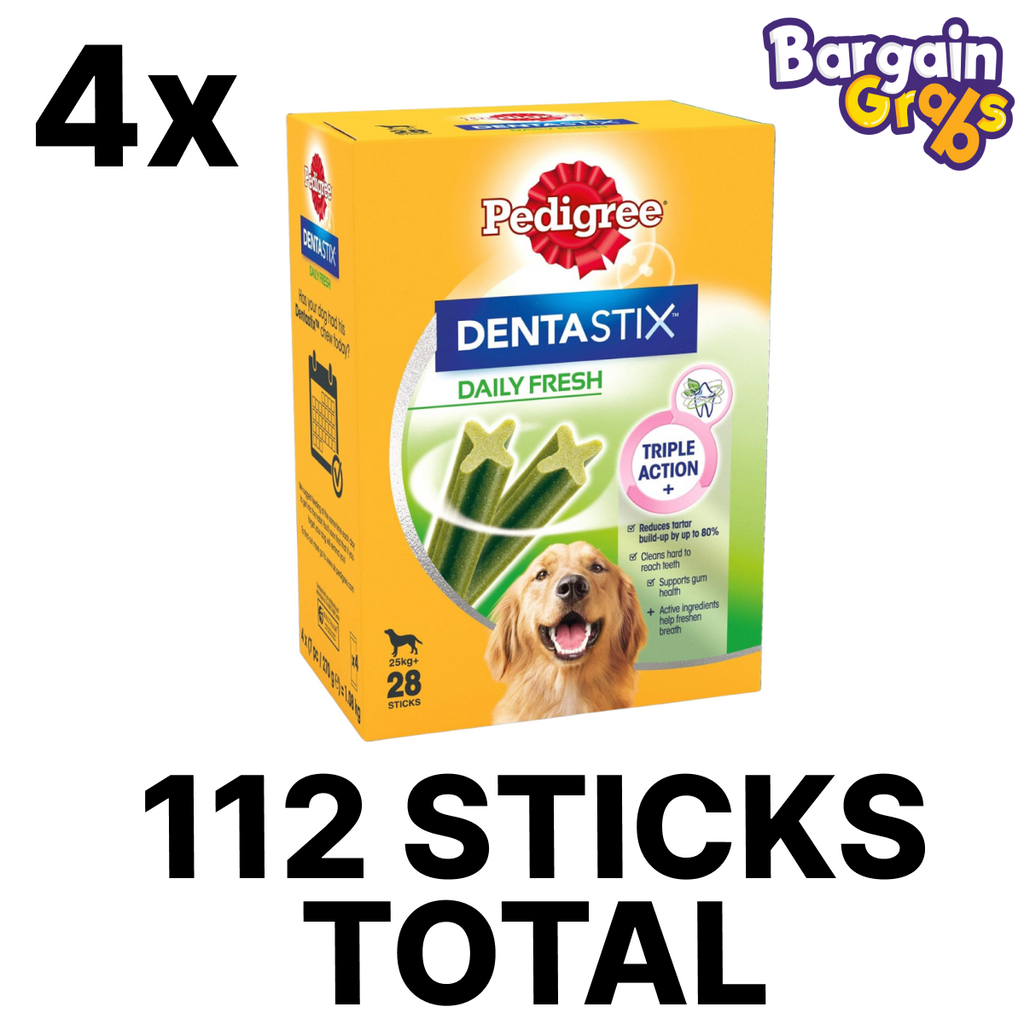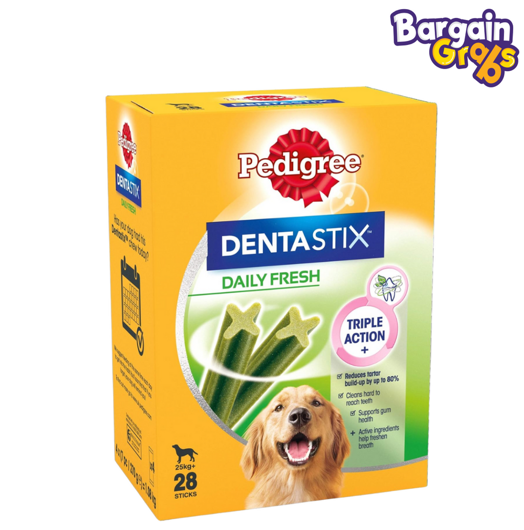 Keep your large dog’s teeth clean and breath fresh with Pedigree Dentastix Fresh Daily Dental Chews, available in 56-stick and 112-stick pack sizes. Specially formulated for large dogs, these dental chews are scientifically proven to reduce tartar build-up by up to 80% when used daily, supporting healthier teeth and gums.